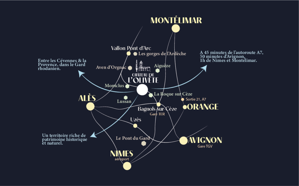 Adresse : Château de l’Olivète – 3728 route de Barjac, 30630 Cornillon (Gard – FRANCE)