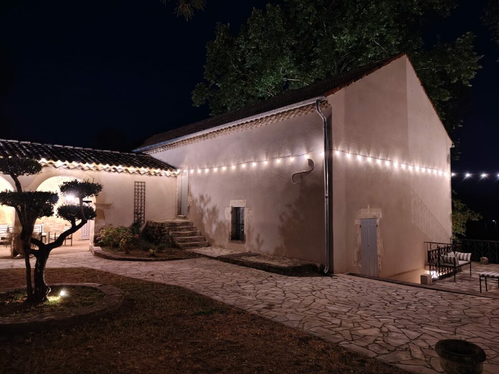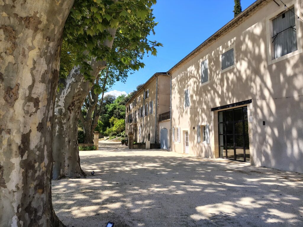En extérieur, vous disposez de la grande esplanade devant la demeure, à l’ombre des platanes bicentenaires pour installer vos invités lors d’un repas ou d’un cocktail.